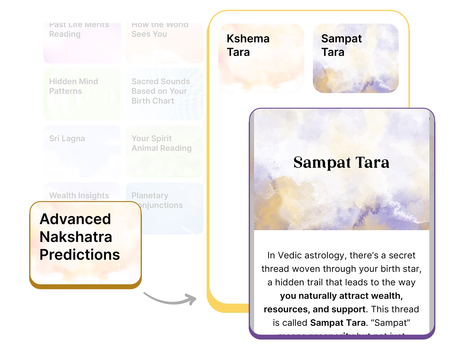 “Sampat” means prosperity. Your Sampat Tara shows the Nakshatras that naturally support your growth – financially, emotionally, and spiritually. These aren’t just lucky stars. They’re your personal abundance companions.