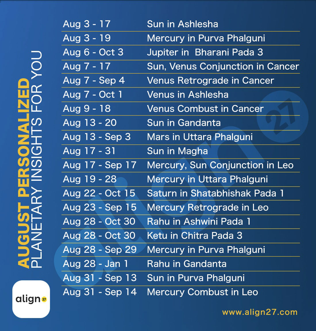 What does August have in store for you? See the transits that are happening in the sky in August and read personalized insights for each one based on your Vedic Moon sign in your birth chart (which we calculate for you in the align27 app).