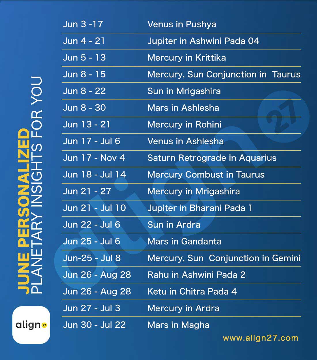 What does June have in store for you? See the transits that are happening in the sky in June and read personalized insights for each one based on your Vedic Moon sign in your birth chart (which we calculate for you in the align27 app).