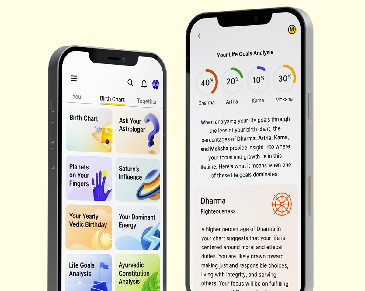 Each person prioritizes life goals differently based on their horoscope, circumstances, and life stage. By analyzing your birth chart, you can see the breakdown of your Purusharthas (Life Goals), offering clarity on your purpose. When your actions align with these goals, life flows smoothly. Misalignment, however, can lead to obstacles and challenges.