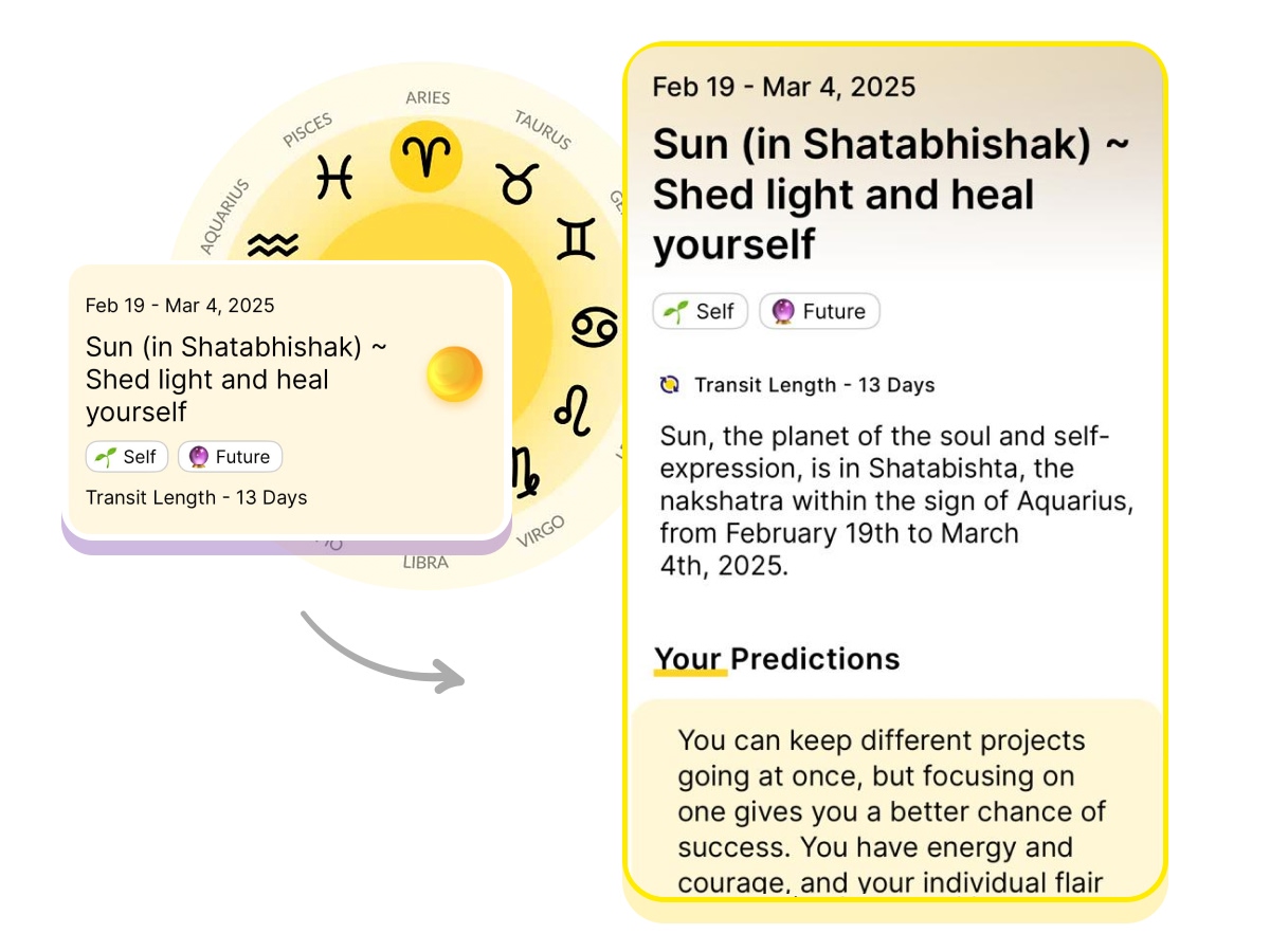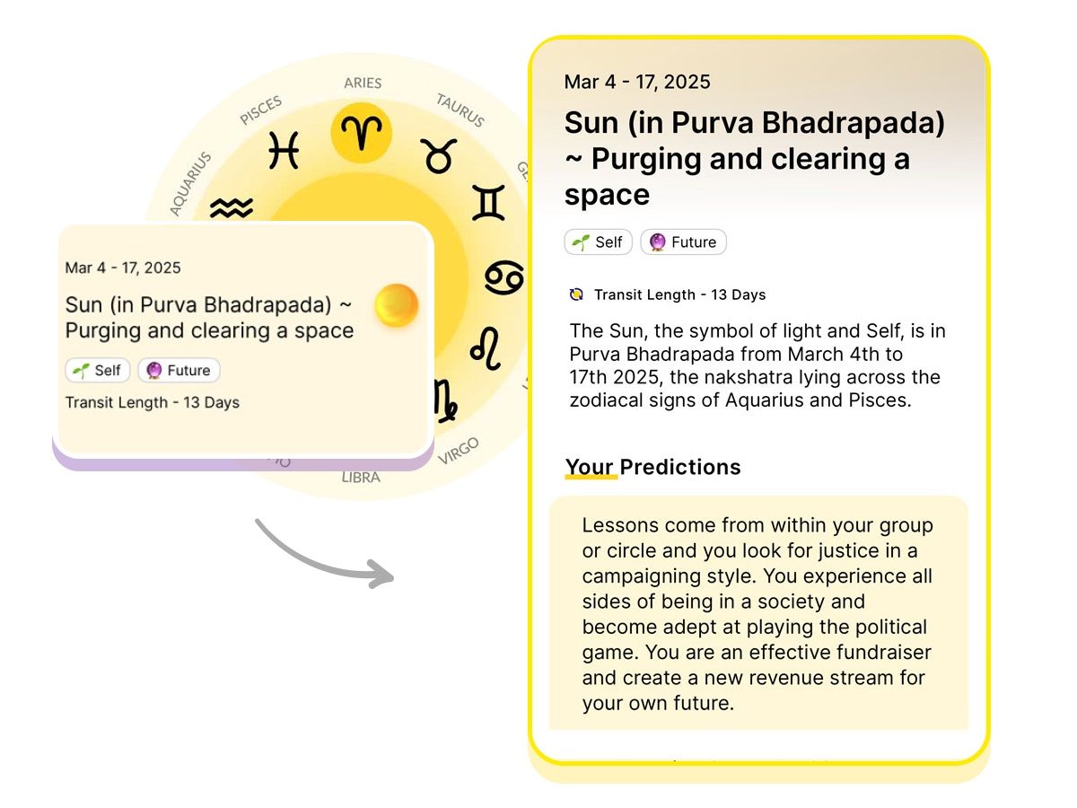 As the Sun enters the first two padas of Purva Bhadrapada Nakshatra, a deep transformational energy is at play. This nakshatra is associated with intensity, spiritual awakening, and profound wisdom. It encourages facing challenges with courage and resilience, as well as letting go of limiting beliefs.