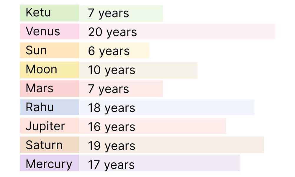 According to Sage Parashara, the renowned father of Jyotish or Vedic Astrology, each of the Navagraha, or nine planets, controls a particular time period. The nine planets include the seven classical planets plus Rahu and Ketu, the north and south nodes of the Moon. According to the Dasha system used most commonly by Vedic astrologers – the Vimshottari Dasha system – the age of a human being is considered to be 120 years. This span is divided into nine periods, each of which is ruled by a particular planet for a specific number of years. The planets fall into a certain sequence, as follows.