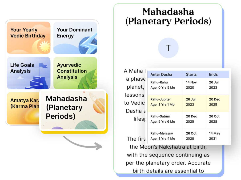A Maha Dasha, or “great period” is a span of time in an individual’s life that is ruled by a particular planet, and provides a system to judge the effects of the planets through a person’s lifetime.