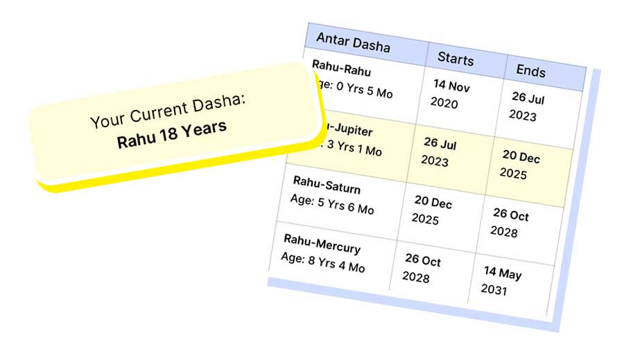 Each Mahadasha is further divided into nine segments which are called Antardashas, and each of these is also ruled by one of the nine planets. While Mahadashas influence the large cycles of your life, or the big picture, Antar Dashas indicate what you are experiencing in your immediate environment.
