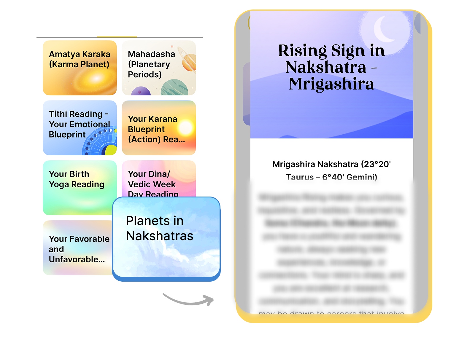 We’ll soon unveil the meanings of all planets in Nakshatras, but for now, start by exploring your Rising Sign Nakshatra in the app.