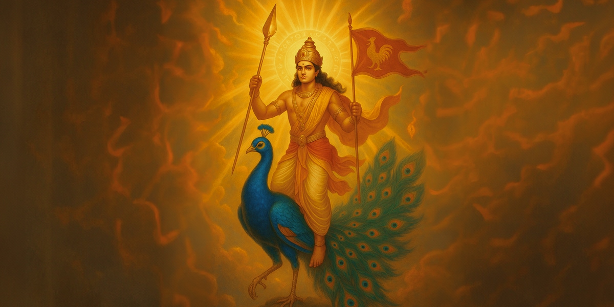 A demon named Surapadma caused havoc among the gods, empowered by his invulnerability. The gods sought help from Lord Shiva, who created Subramanya or Kartikeya from his third eye, embodied in six radiant sparks. These sparks merged into a child with six faces, hence his name Arumugam (Aru: six, Mugam: face). Kartikeya, armed with a divine spear from Goddess Parvati, vanquished Surapadma on the sixth lunar day, Shashti. He then showed mercy, transforming the demon into a peacock, his mount, and a cock for his banner.