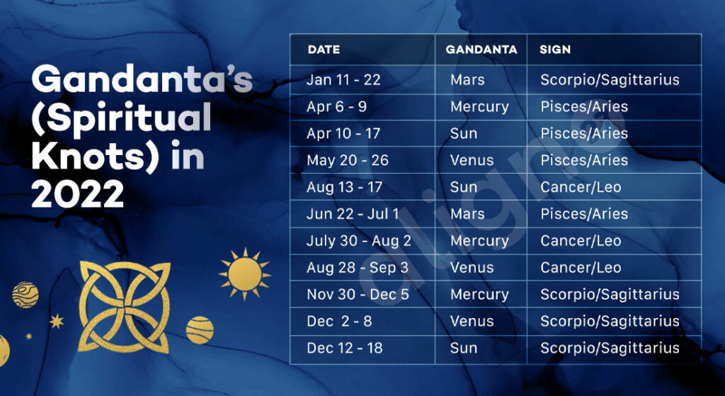 In Vedic astrology, junctions between fire and water signs (which cannot coexist, obviously) are called Gandanta zones, also known as spiritual knots, and we have 11 main Gandanta’s this year, starting with Mars in Gandanta on 11th January.