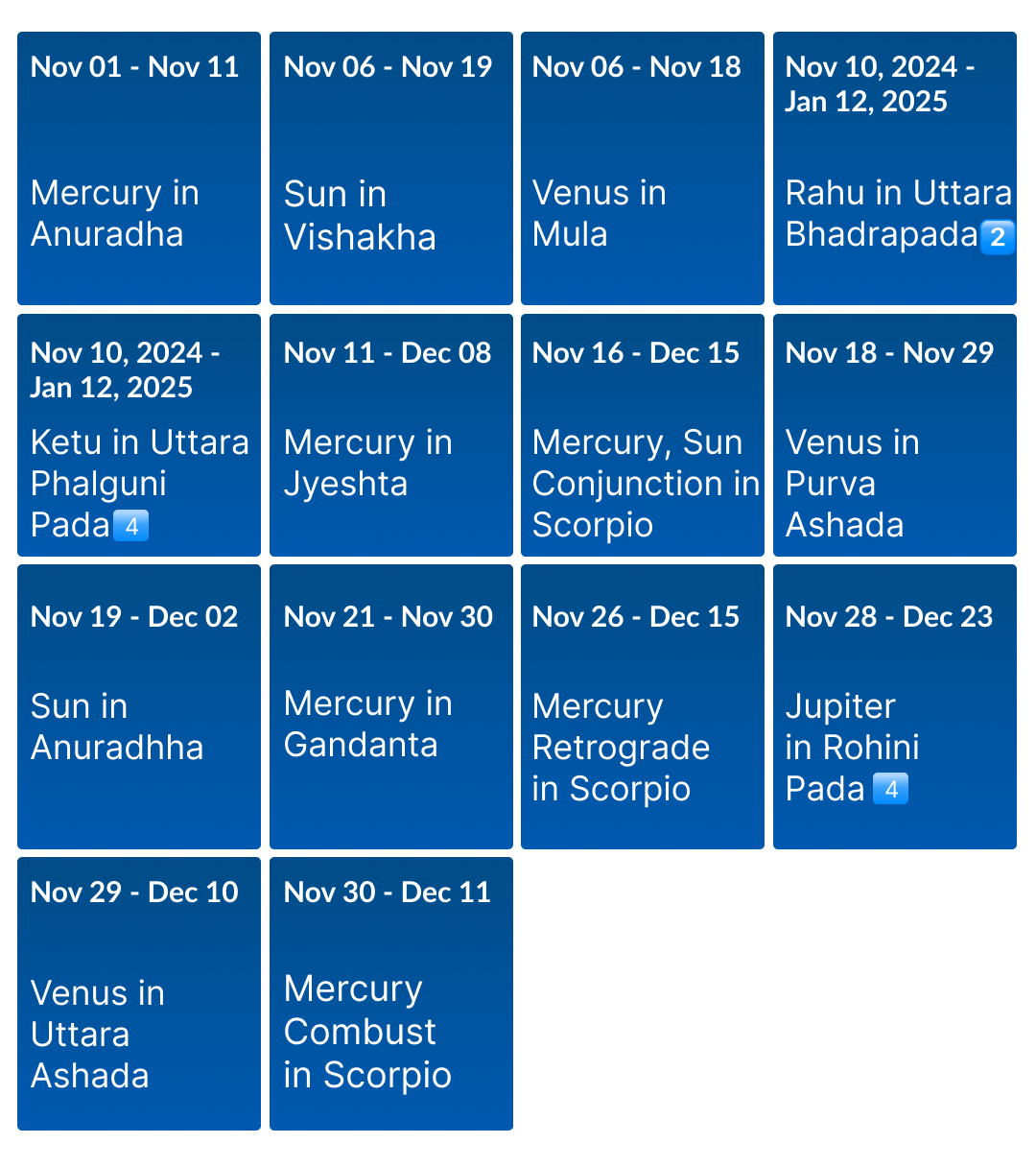 November will feature 14 planetary transits, including retrograde and conjunctions.