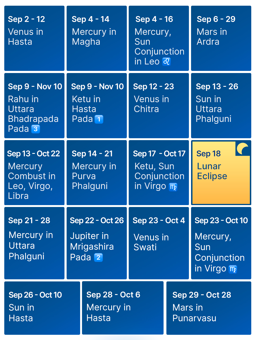 September will feature 19 planetary transits, including eclipses, combustions and conjunctions.