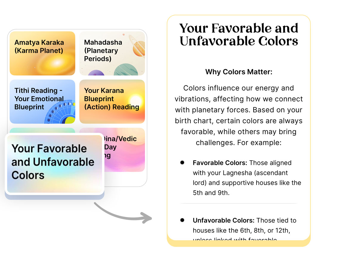 Colors influence our energy and vibrations, affecting how we connect with planetary forces. Based on your birth chart, certain colors are always favorable, while others may bring challenges. For example: