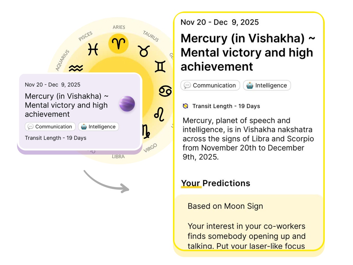 Mercury, planet of speech and intelligence, is in Vishakha nakshatra across the signs of Libra and Scorpio from November 20th to December 9th, 2025.