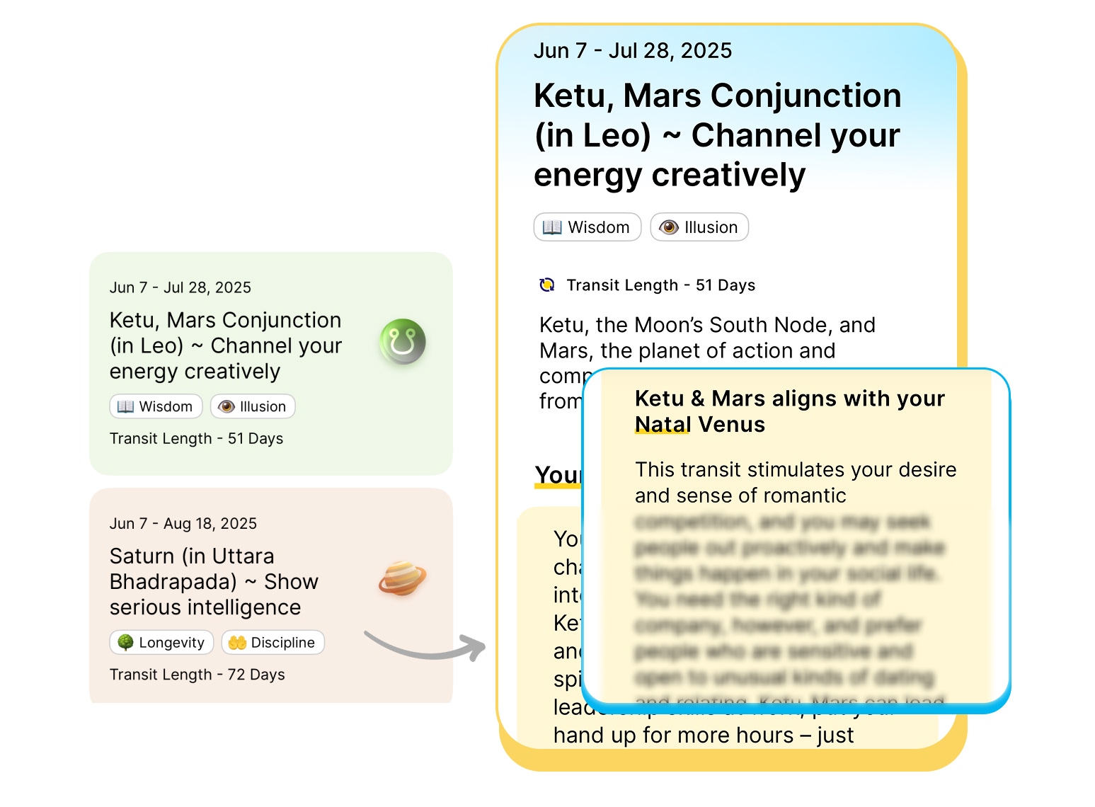 ✅ Insights when a transit planet crosses over a planet in your birth chart – a rare and powerful indicator that can mark major life events.